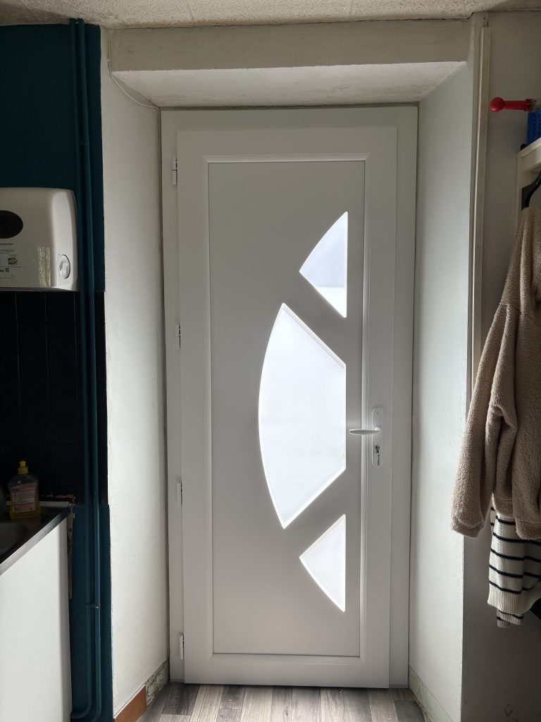 Pose de fenêtres sur mesure en PVC avec verre dépoli dans une buanderie à Angers – chantier réalisé avec finitions intérieures et adaptation aux contraintes techniques.